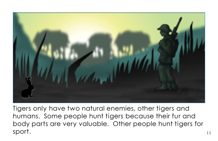 "All About Tigers" is a 12 page informational book for second grade readers. Each page is illustrated in color. Each page describes facts about tigers.