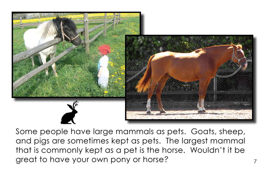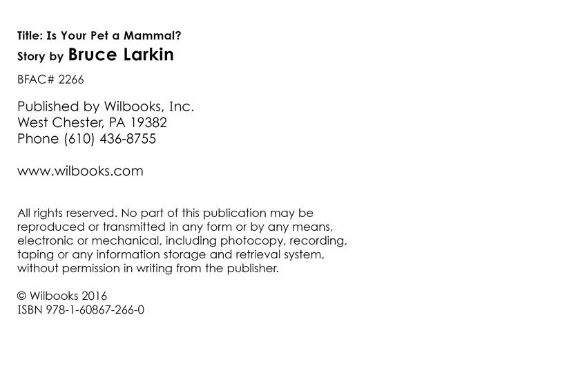 "Is Your Pet a Mammal?" is an 8-page informational book for first grade readers. Through photos and text, this book describes the characteristics of mammals and demonstrates that some pets are not mammals.