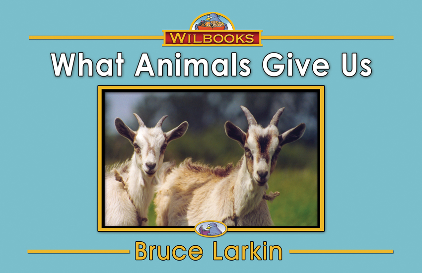 "What Animals Give Us" is an 8-page informational book for first grade readers. This book shows us six products that come from animals. Page 8 is a review of the book.