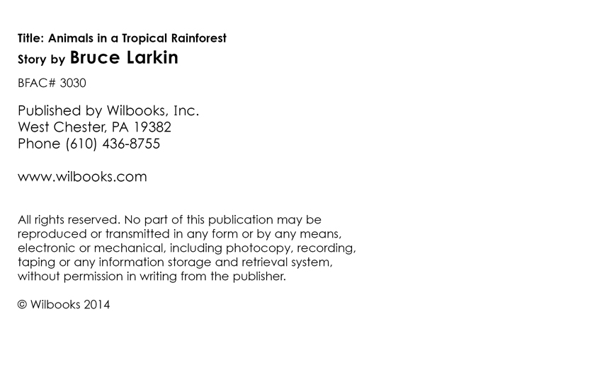 "Animals in a Tropical Rainforest" is an 8-page informational book for first grade readers. Each page is illustrated with a rainforest animal, along with a repetitive sentence.