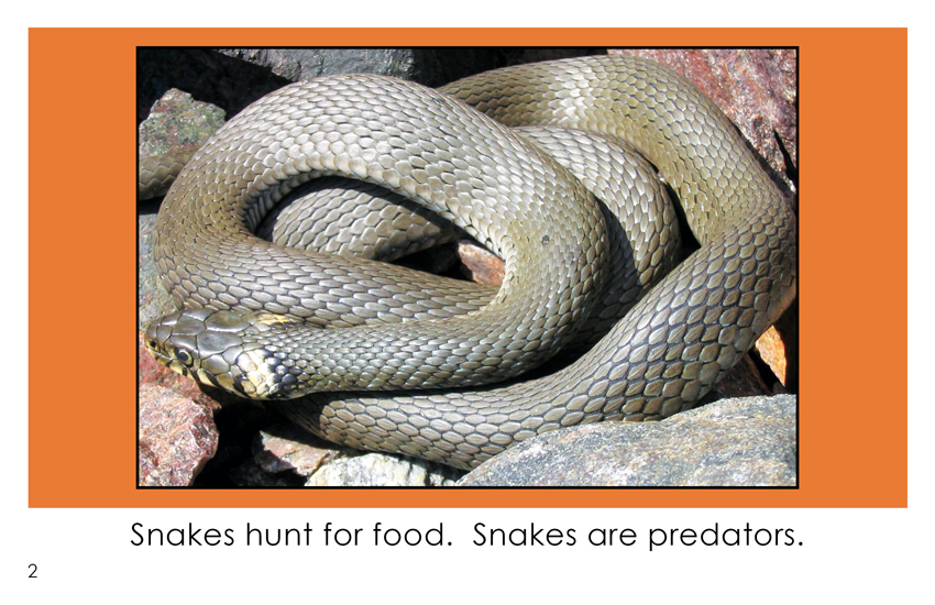 "Predators Are Hunters" is an 8-page informational book for first grade readers. This book pictures six predators along with two short repetitive sentences on each page. Page 8 is a review of the book.